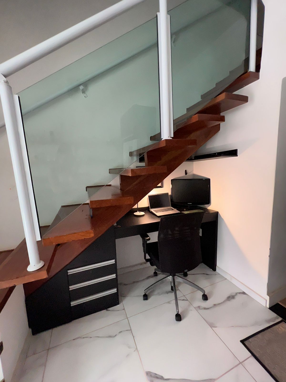 • Escritório: Funcional e bem planejado, com escrivaninha e armário sob a escada, ideal para home office ou estudos.