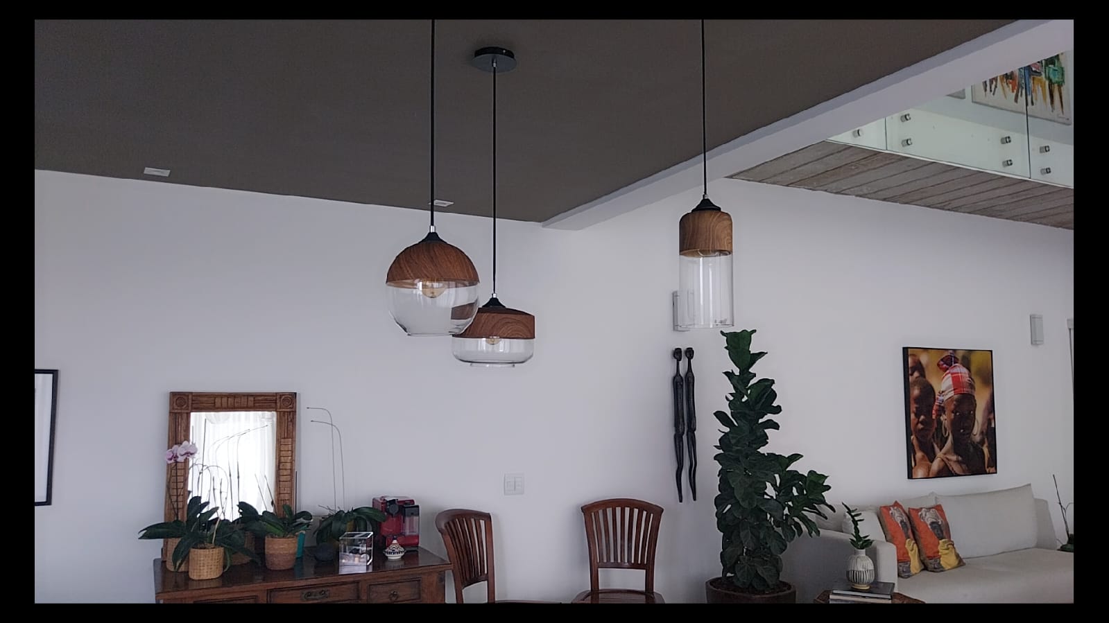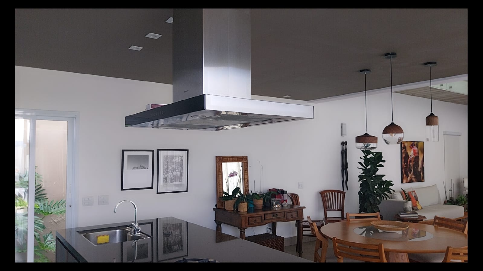 A casa possui excelente iluminação natural durante todo o ano, graças ao projeto que inclui grandes painéis de vidro e claraboias, tornando os ambientes ainda mais agradáveis e acolhedores.
