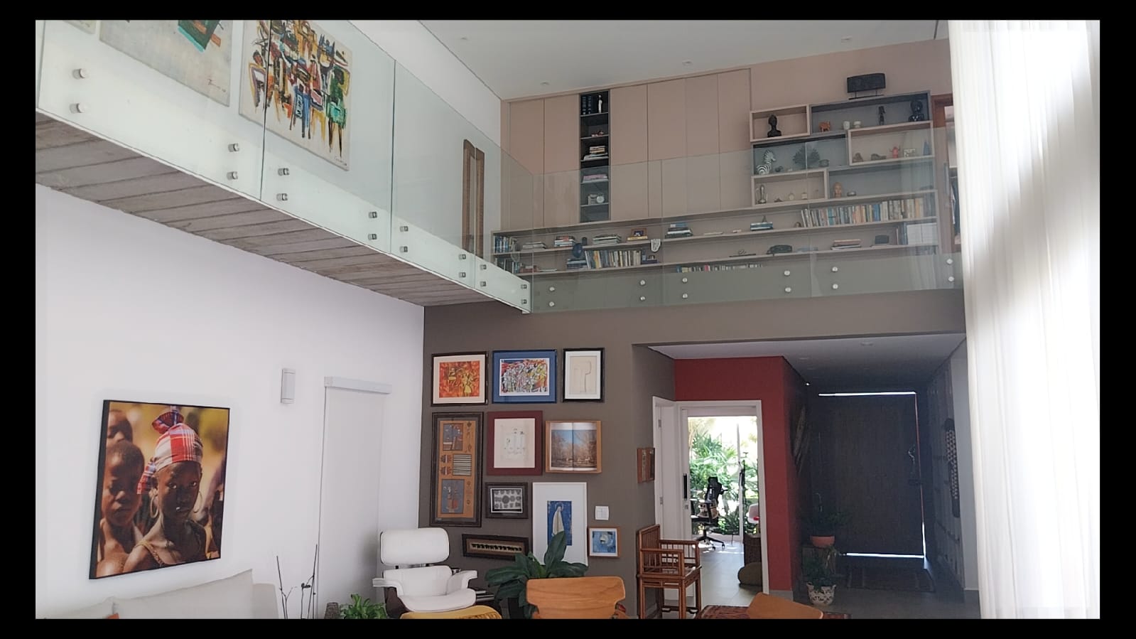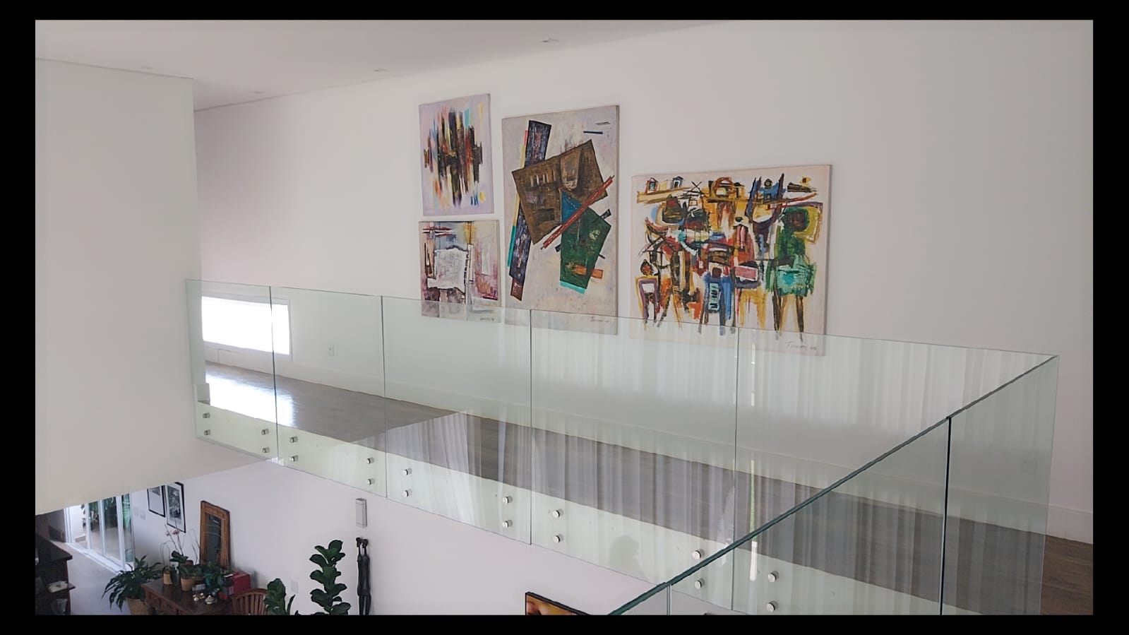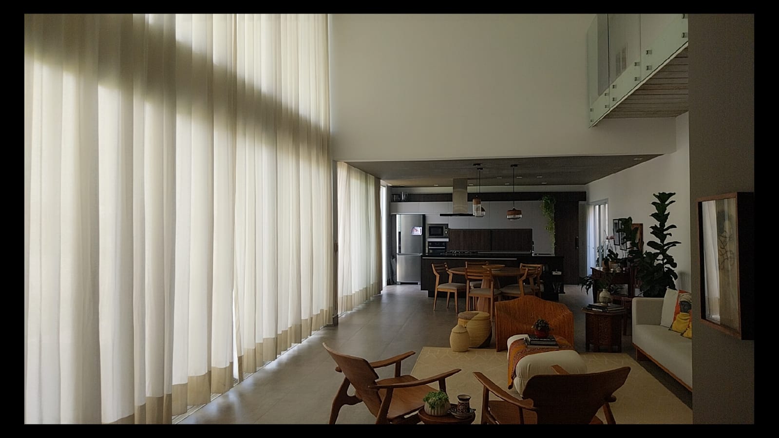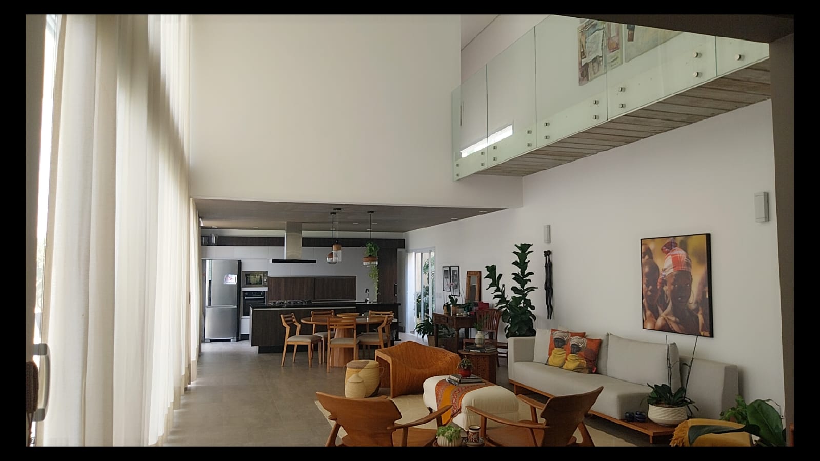 Logo na entrada, o destaque é a imponente sala de estar com pé-direito duplo de aproximadamente 6 metros, criando um ambiente amplo, iluminado e extremamente elegante. As galerias no pavimento superior com parapeito em vidro permitem uma vista privilegiada da sala, valorizando ainda mais o design moderno da casa.