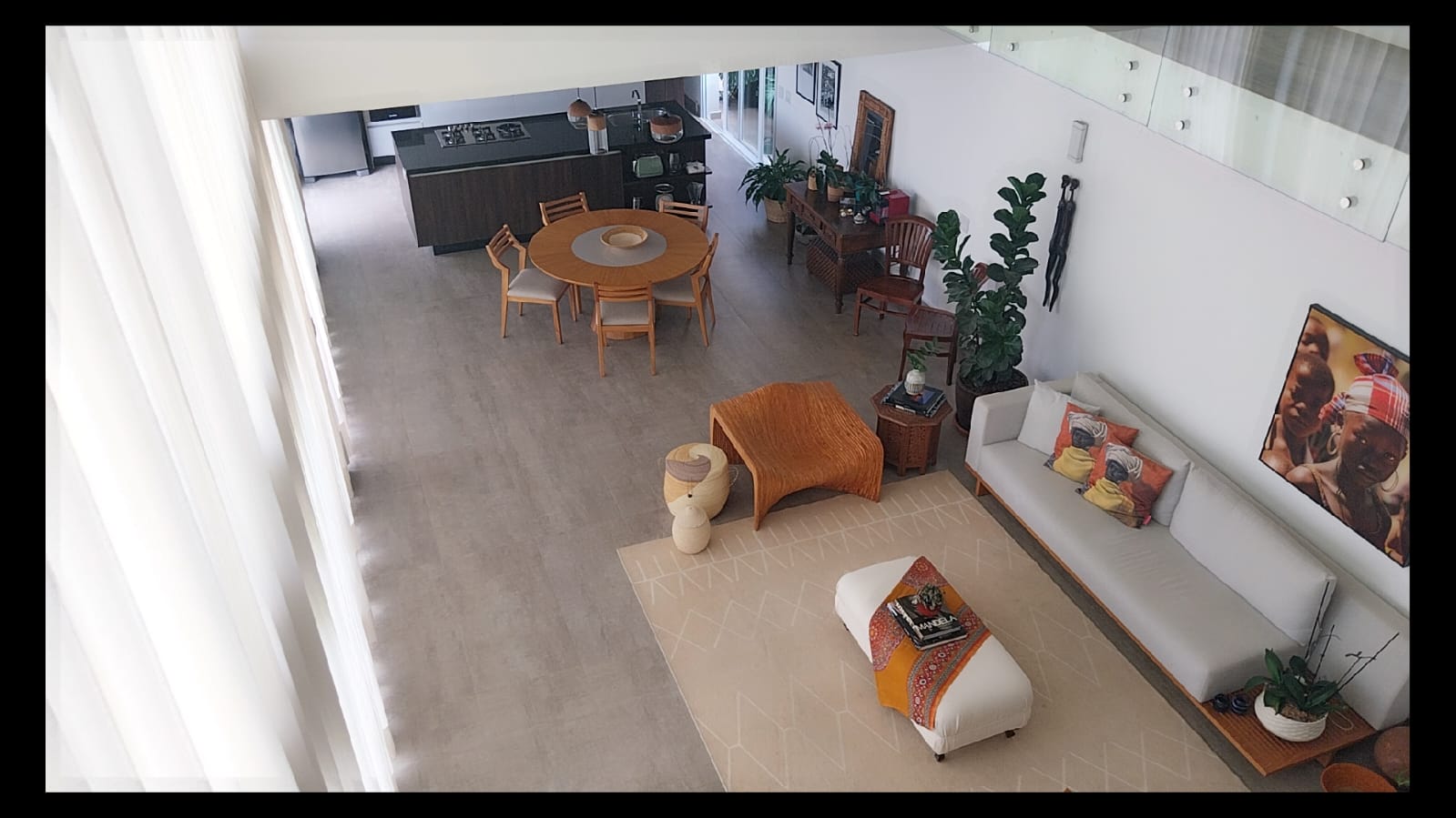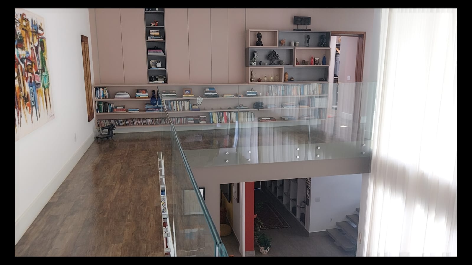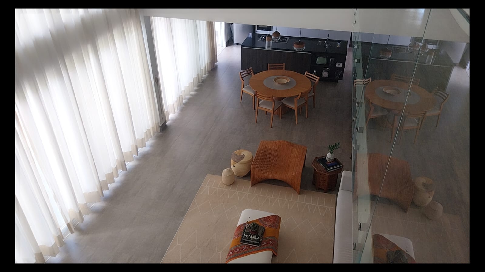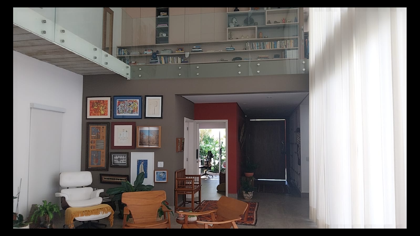 Logo na entrada, o destaque é a imponente sala de estar com pé-direito duplo de aproximadamente 6 metros, criando um ambiente amplo, iluminado e extremamente elegante. As galerias no pavimento superior com parapeito em vidro permitem uma vista privilegiada da sala, valorizando ainda mais o design moderno da casa.