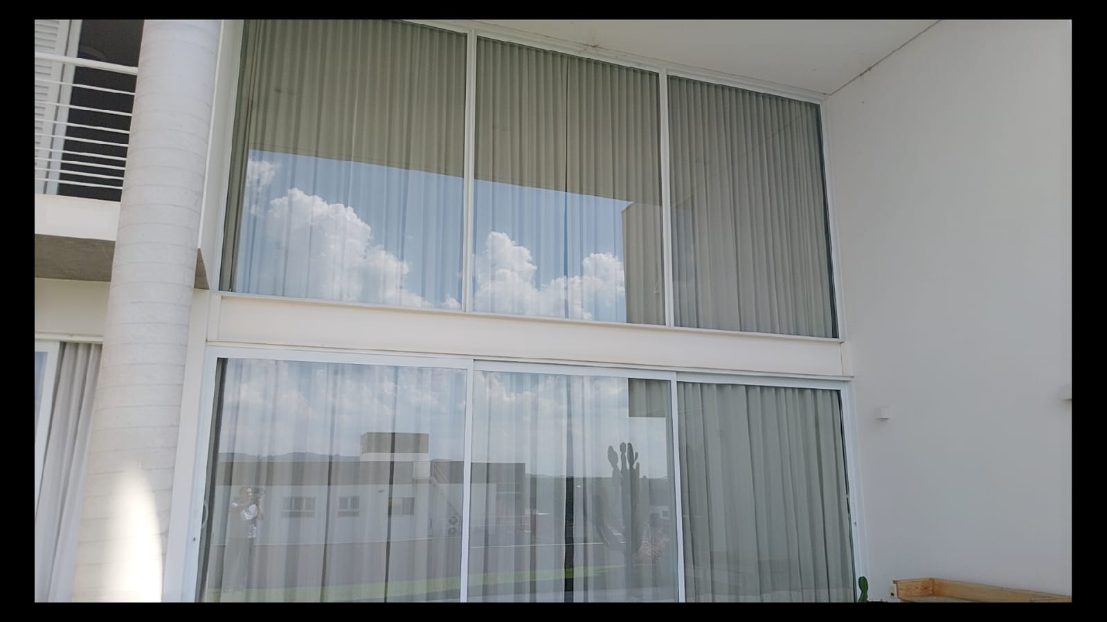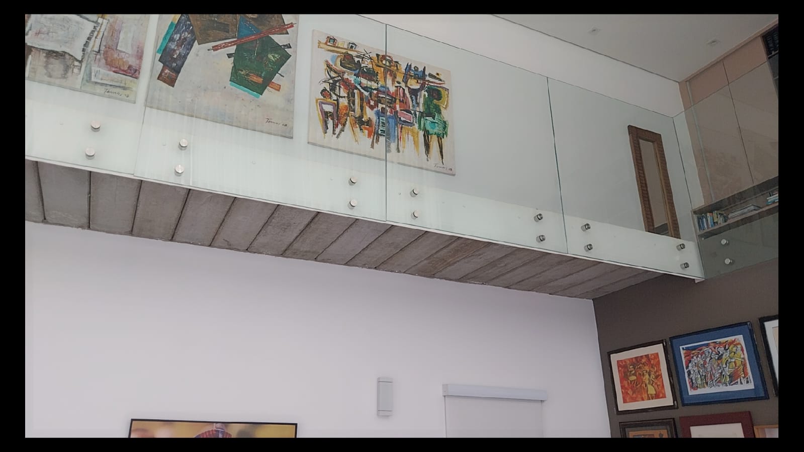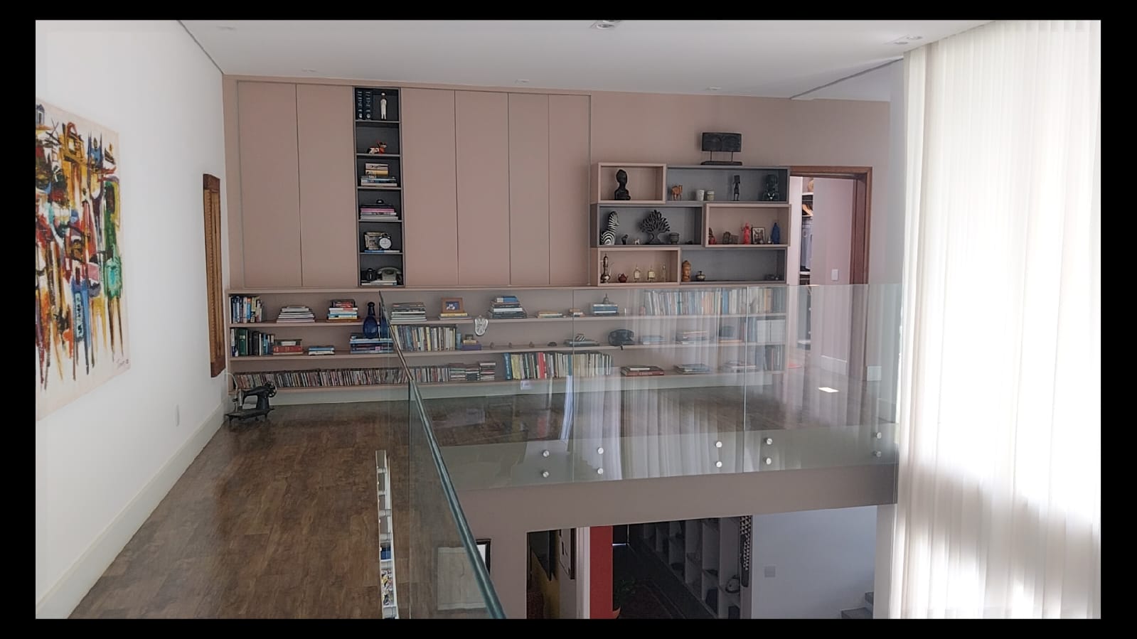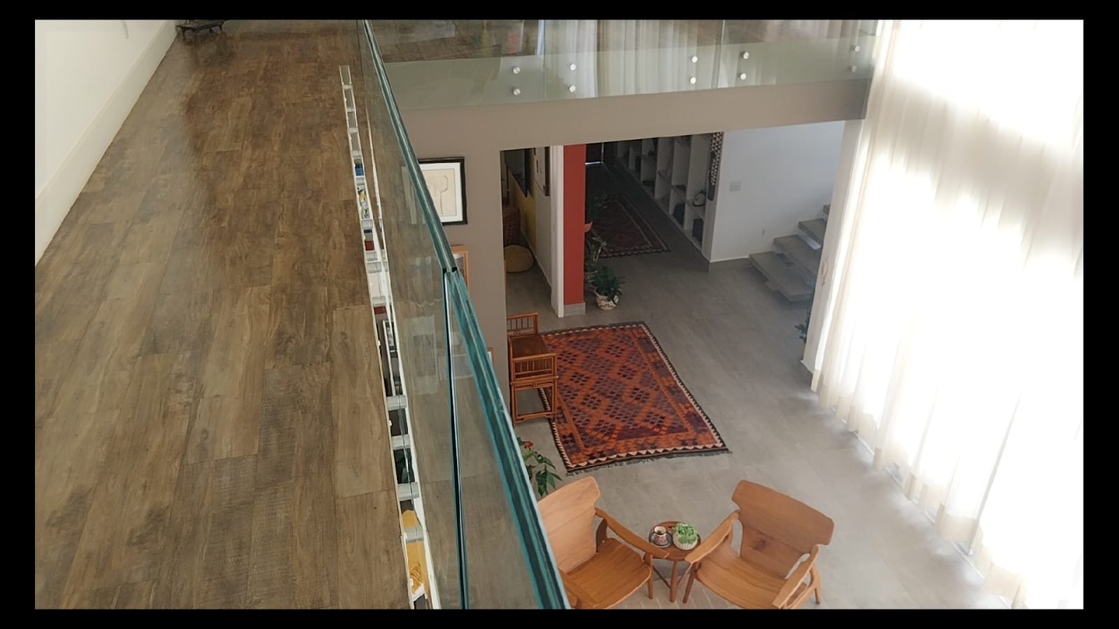 Logo na entrada, o destaque é a imponente sala de estar com pé-direito duplo de aproximadamente 6 metros, criando um ambiente amplo, iluminado e extremamente elegante. As galerias no pavimento superior com parapeito em vidro permitem uma vista privilegiada da sala, valorizando ainda mais o design moderno da casa.