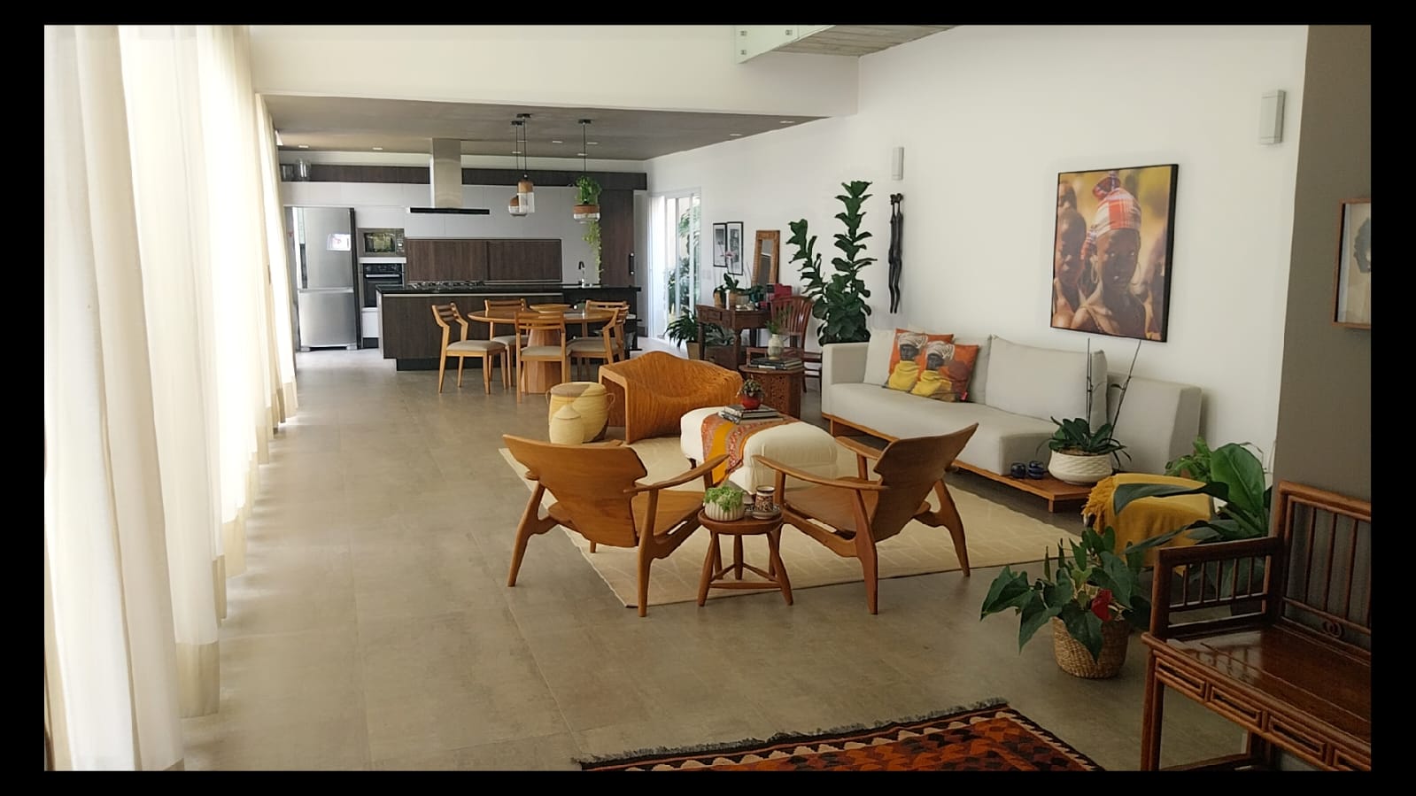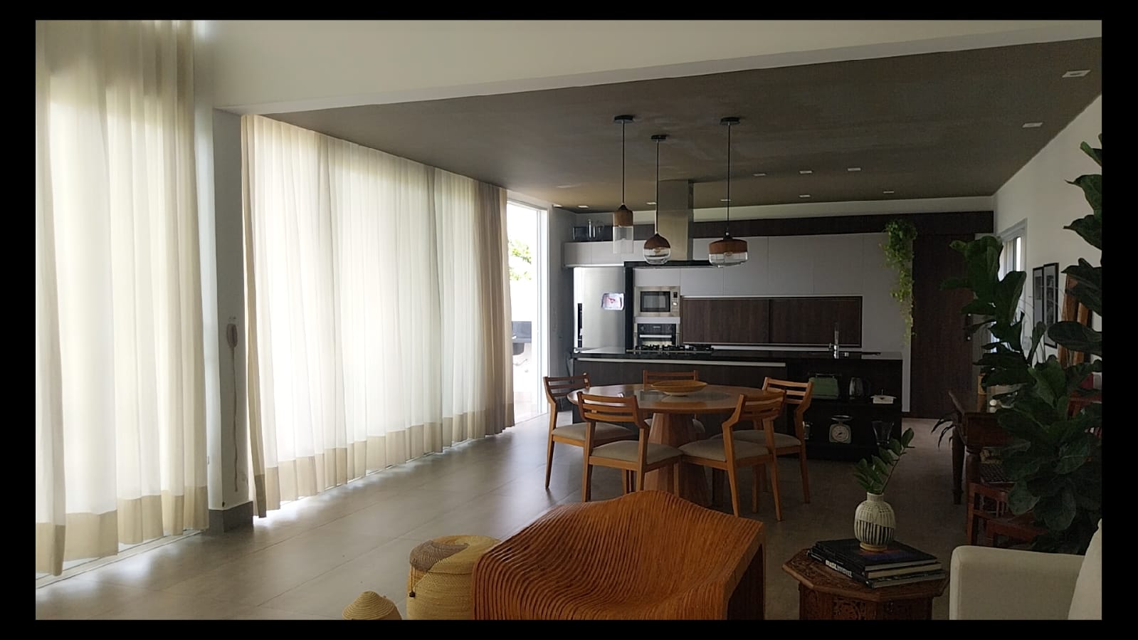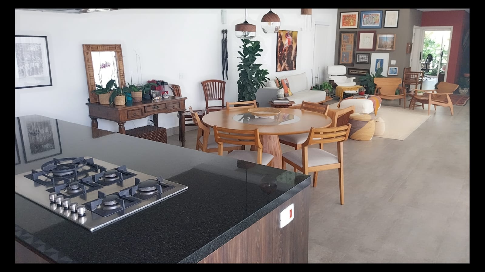 A sala de jantar, integrada à sala de estar e à cozinha, proporciona um espaço perfeito para receber familiares e amigos, com ambientes amplos e totalmente integrados.