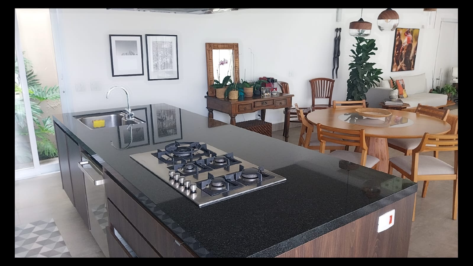 A cozinha planejada é um verdadeiro destaque: equipada com armários funcionais, eletrodomésticos de alto padrão e uma ilha central de aproximadamente 8 m², com cooktop, máquina de lavar e gaveteiros especiais, oferecendo praticidade e sofisticação para o dia a dia.