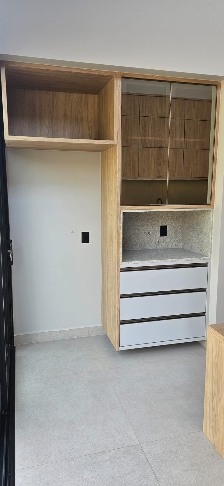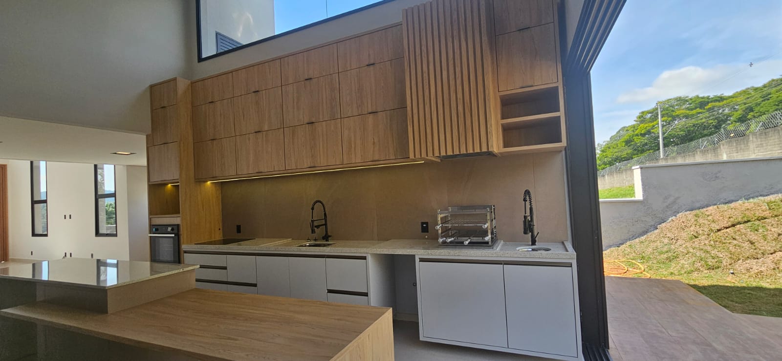 • Área gourmet moderna, equipada com móveis planejados, cooktop elétrico, forno Brastemp 84L e