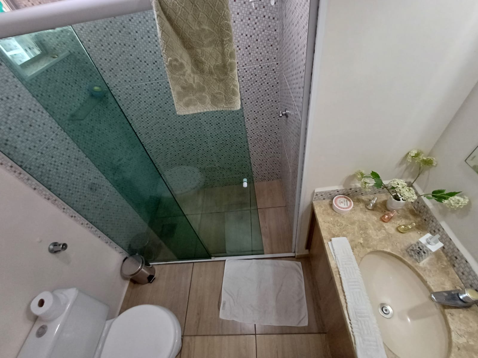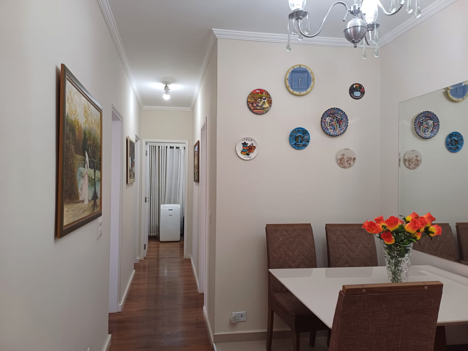 Duas salas integradas, 1 cozinha espaçosa, 3 dormitórios - sendo um transformado em closet, 2 banheiros, 2 vagas de garagem coberta, salão de festas + churrasqueira.