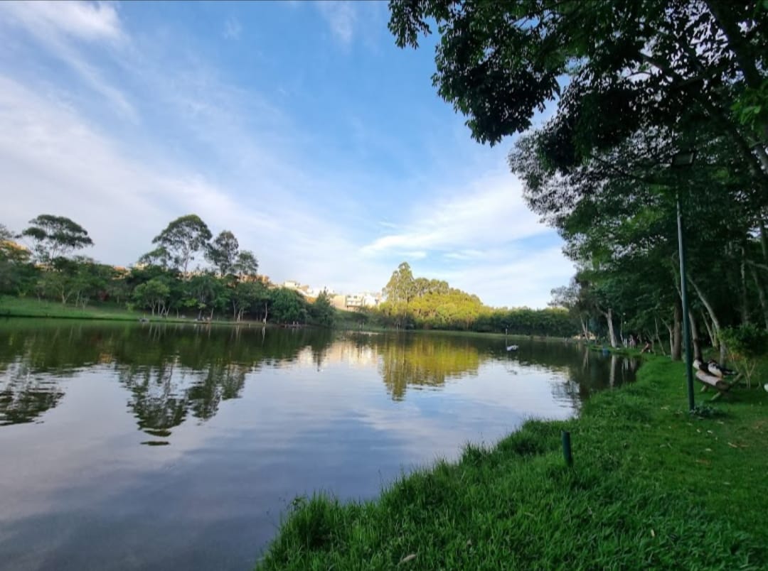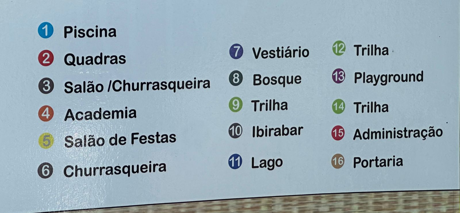 Piscina adulto, piscina infantil, sauna, vestiários, quadras, academia, salão de festas, salão de jogos, campo de futebol, área de churrasco, playground, bosque, trilha e lago com deck de madeira.