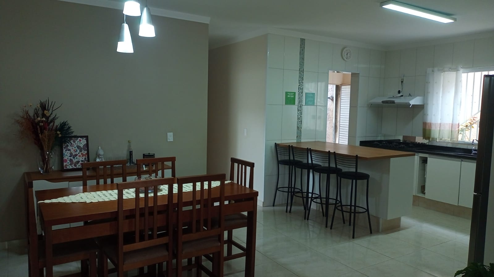 Ambientes integrados e modernos, compostos de: cozinha, sala de jantar e de estar.