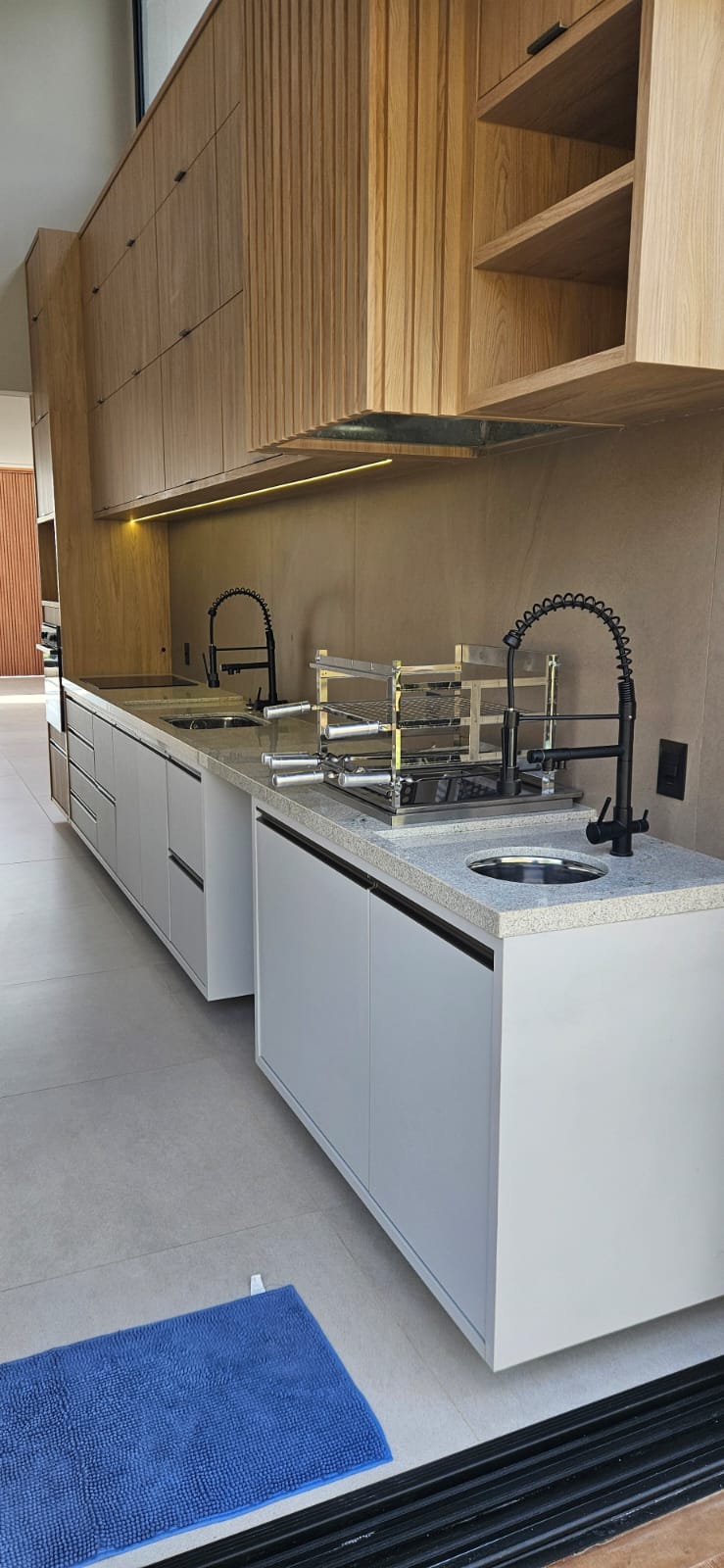 • Área gourmet moderna, equipada com móveis planejados, cooktop elétrico, forno Brastemp 84L e churrasqueira