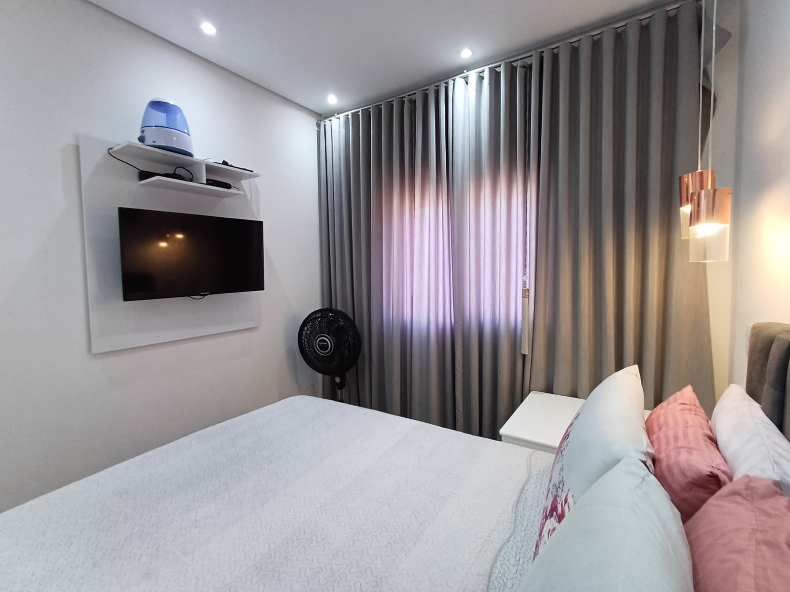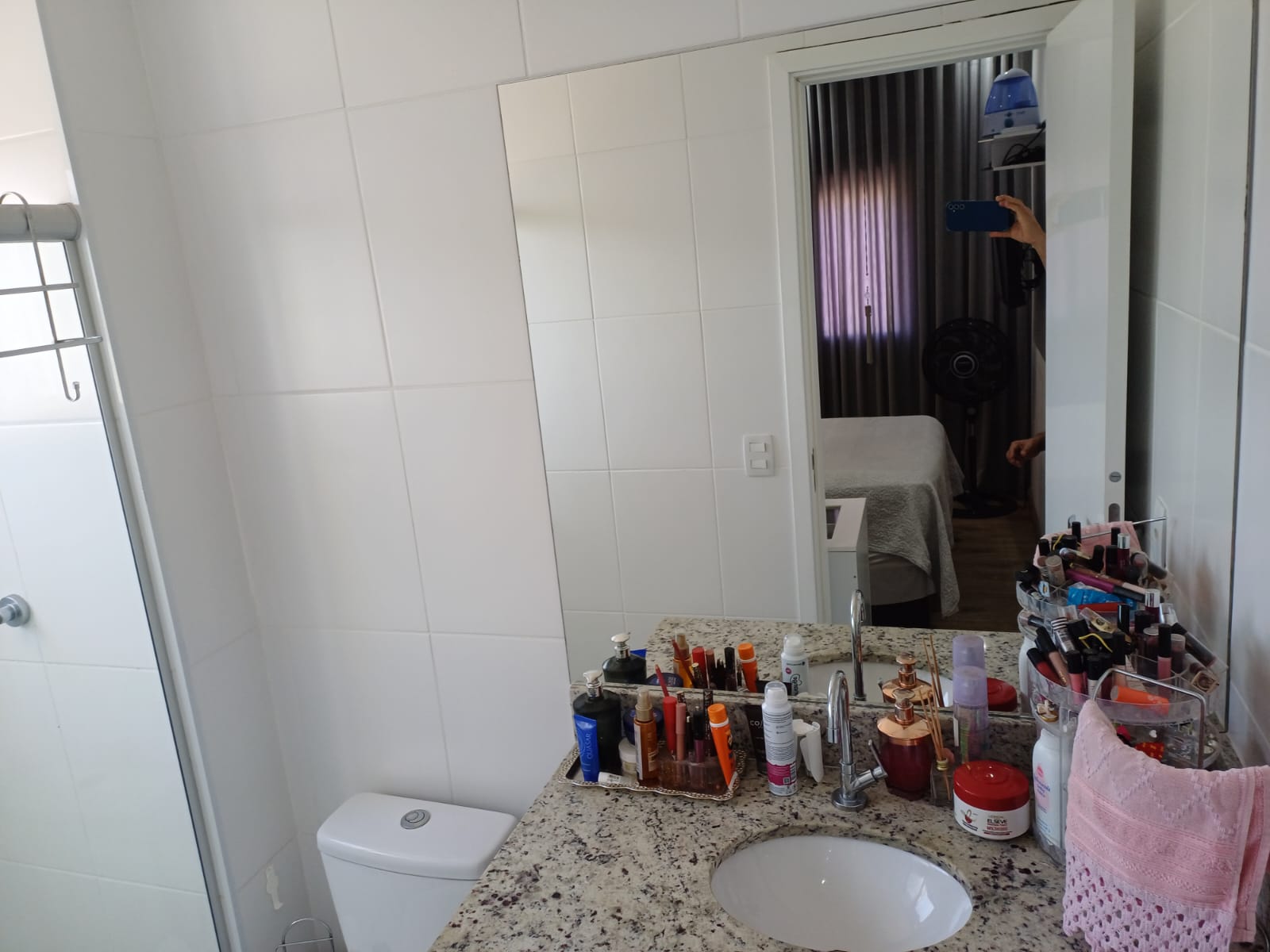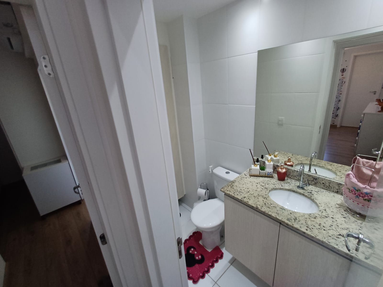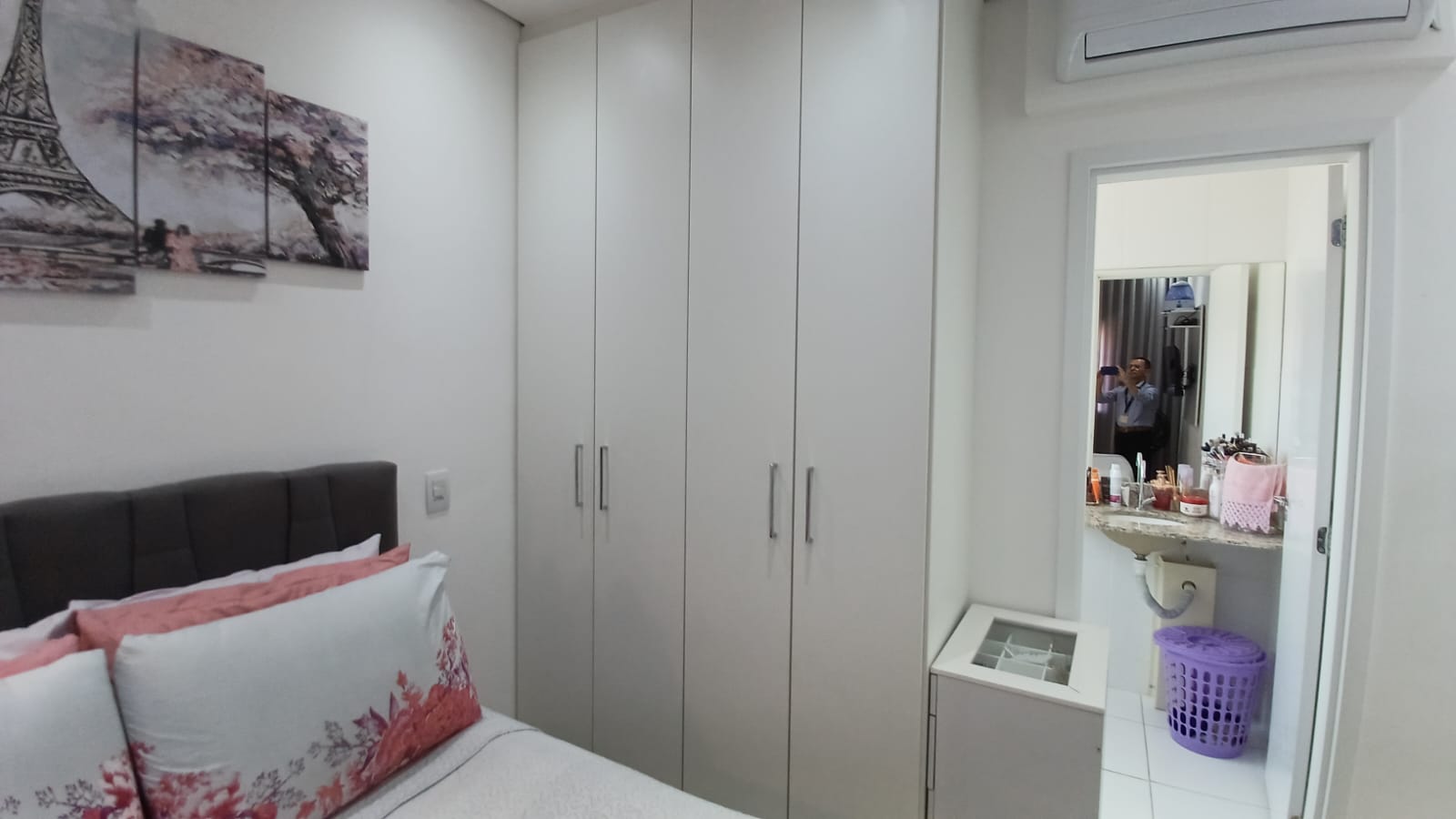 O apartamento é composto de dois quartos, sendo duas suítes + 1 banheiro social, sala ampliada (com possibilidade de ser 3 quartos), sacada, 2 vagas de garagem (1 coberta), ar condicionado instalado em um dos quarta e com tubulação pronta para instalar ar também na sala.