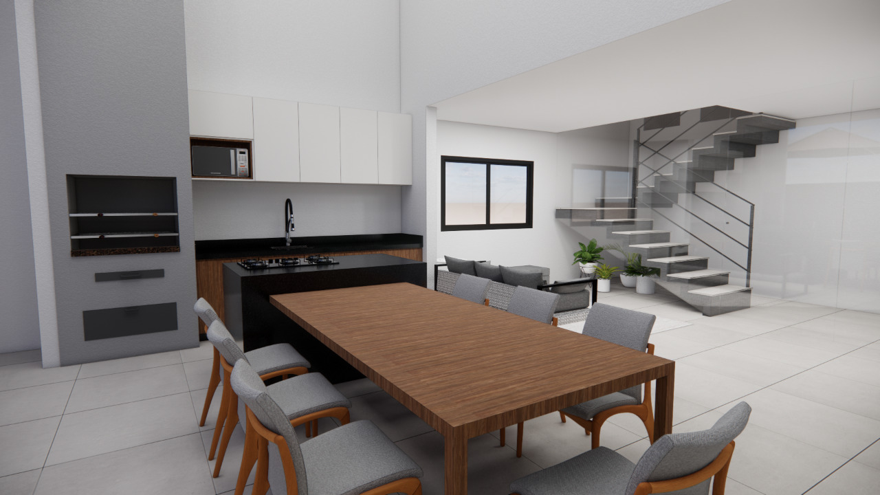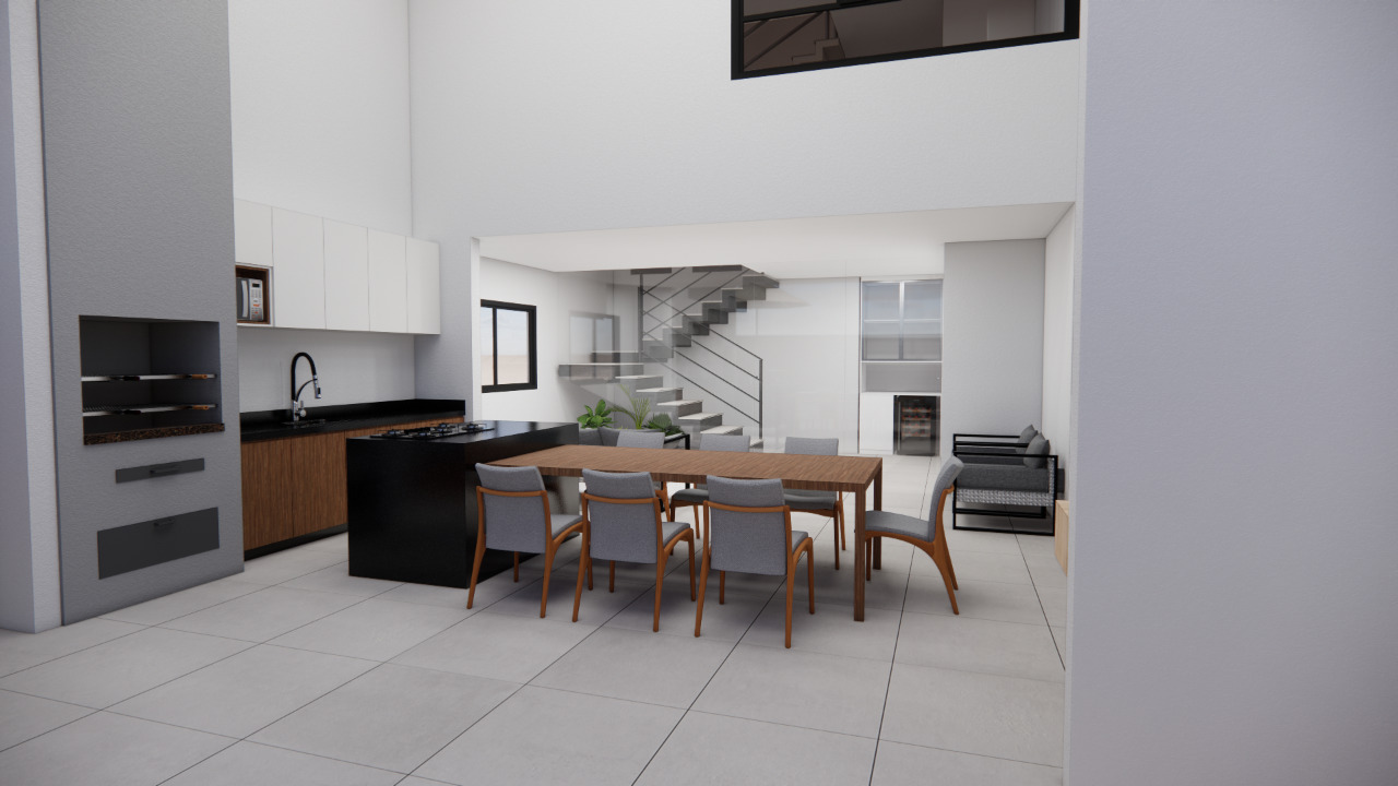 A casa possui três suítes, 5 banheiros, garagem para 3 carros, espaço gourmet e salas com pé direito duplo.