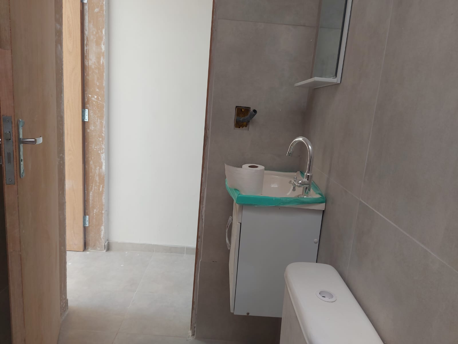 Um espaço abaixo da escada com possibilidade de ser um lavabo ou mesmo uma dispensa
